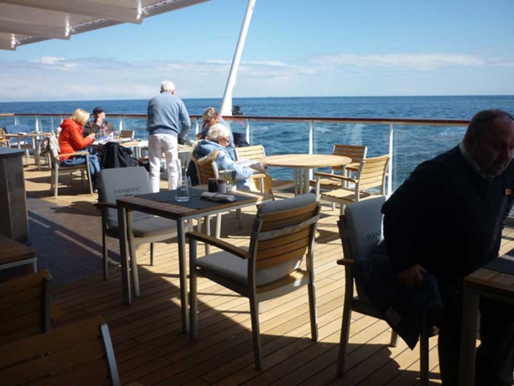 In den Außenbereichen fällt der gläserne Balkon an Back- und Steuerbordseite auf. Wenn er ausgefahren ist steht man direkt über dem Wasser. Im Buffetrestaurant kann man auch draußen essen. Ein kleiner Hinweis darauf, dass Expeditionen auch in wärmere Gefilde führen werden.