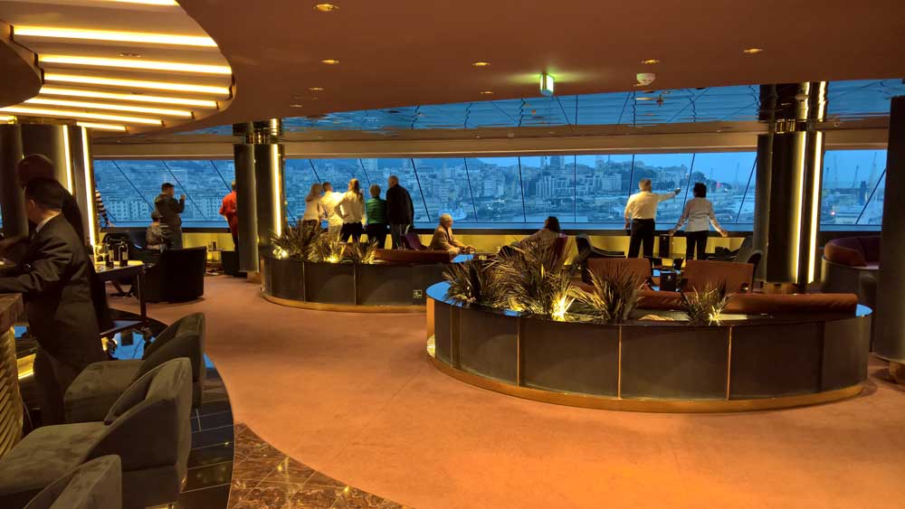 Hier erwarten Sie exquisite A-la-carte Gourmetmenüs zum Mittag- und Abendessen, die selbst anspruchsvolle Gäste begeistern. Natürlich ohne feste Sitzordnung oder feste Sitzungszeiten. Selbstverständlich können Sie hier auch frühstücken. - Top Sail Lounge mit Panoramablick