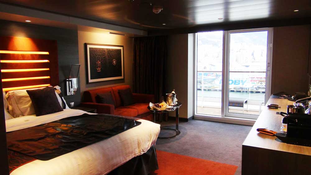 Die Suiten liegen auf den obersten drei Decks im vorderen Teil des Schiffes. Sie haben alle einen privaten Balkon und sind mit mindestens ca. 25m² überdurchschnittlich groß. Auf den neuen Schiffen sind auch Innenkabinen buchbar.