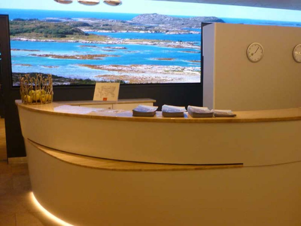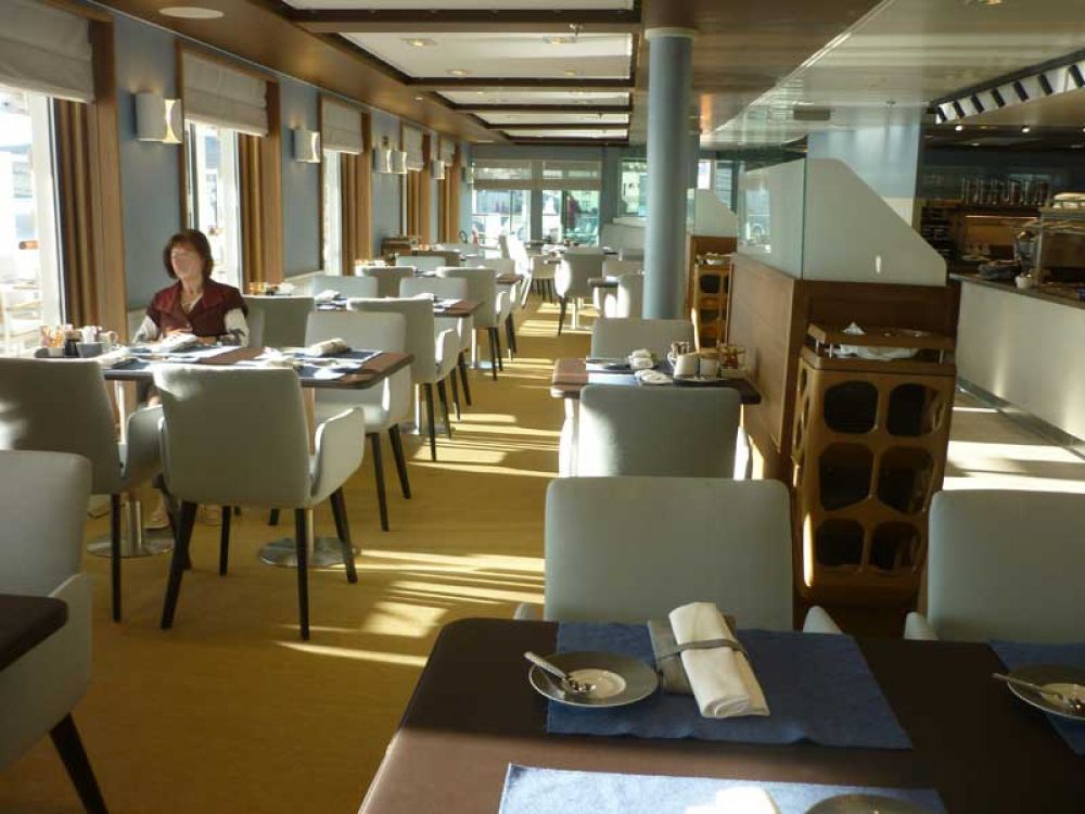 In den Außenbereichen fällt der gläserne Balkon an Back- und Steuerbordseite auf. Wenn er ausgefahren ist steht man direkt über dem Wasser. Im Buffetrestaurant kann man auch draußen essen. Ein kleiner Hinweis darauf, dass Expeditionen auch in wärmere Gefilde führen werden.
