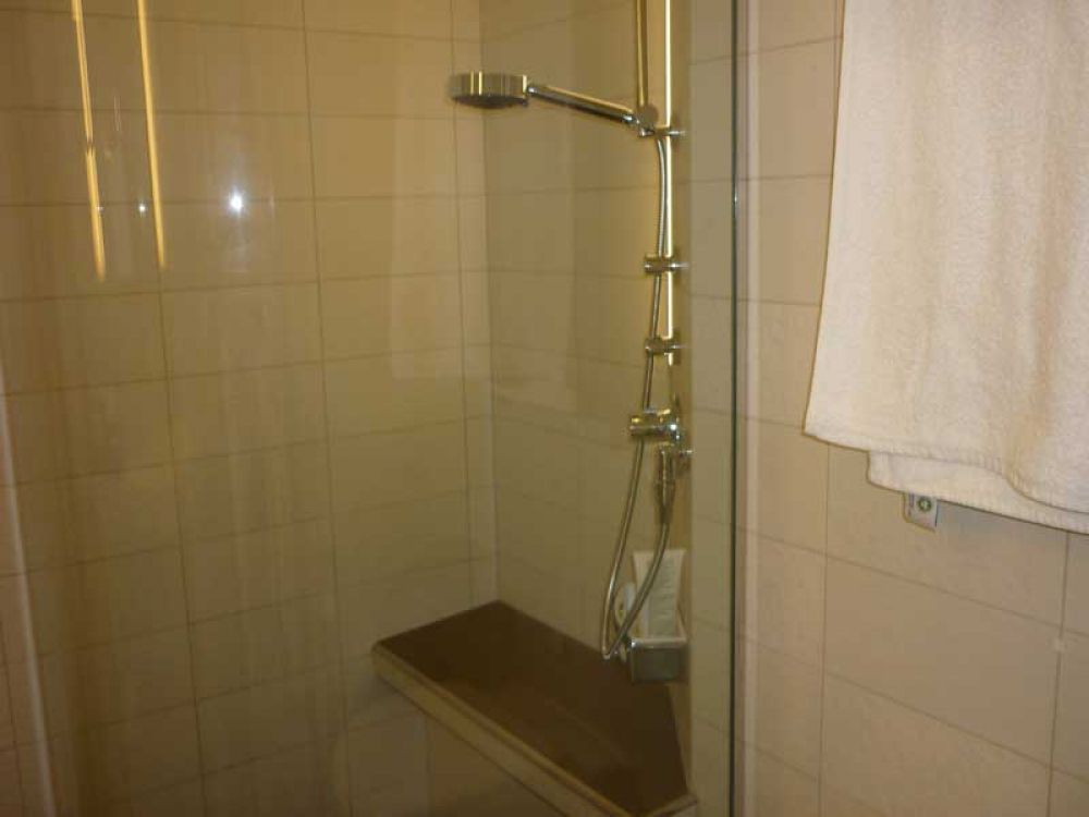 Das Bad überzeugt mit einer Dusche, in der eine Ablage, die auch als Sitzgelegenheit genutzt werden kann, zur Verfügung steht und mit einer beheizbaren Wand zum Trocknen für Handtuch oder nassen Parka. Hochwertige Toilettenartikel, Walkingstöcke, Fernglas und Kaffeemaschine runden das Bild ab.