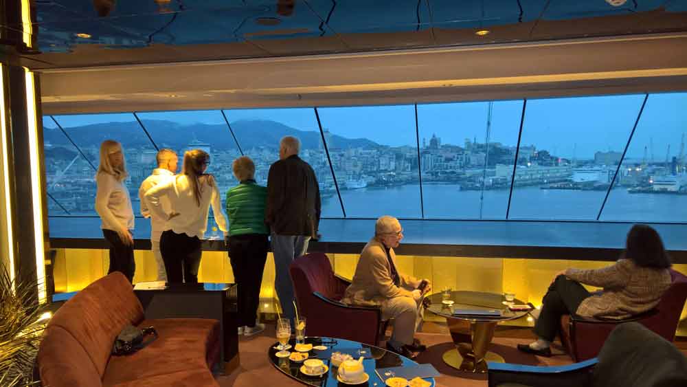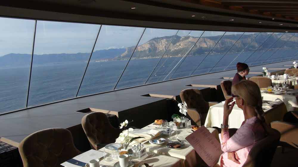 Hier erwarten Sie exquisite A-la-carte Gourmetmenüs zum Mittag- und Abendessen, die selbst anspruchsvolle Gäste begeistern. Natürlich ohne feste Sitzordnung oder feste Sitzungszeiten. Selbstverständlich können Sie hier auch frühstücken. - Top Sail Lounge mit Panoramablick