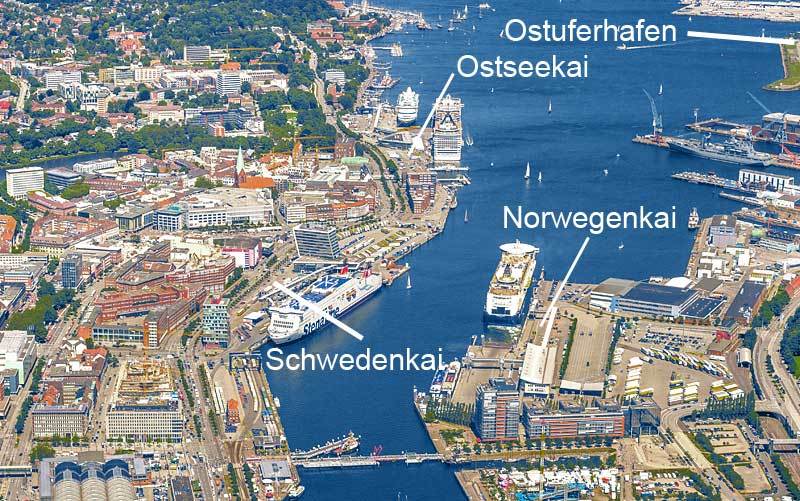 Zum Norwegenkai kommen Sie über die Fussgängerbrücke "Hörnbrücke", die anderen Anlegestellen liegen auf der Seite des Bahnhofs. Lediglich der Ostuferhafen ist, aufgrund der Entfernung vom Banhof aus, zu Fuß schwer erreichbar. Wir empfehlen die Anreise mit dem öffentlichen Nahverkehr oder dem Taxi. Taxen stehen ohne Vorreservierung rund um die Uhr am Kieler Hauptbahnhof bereit.